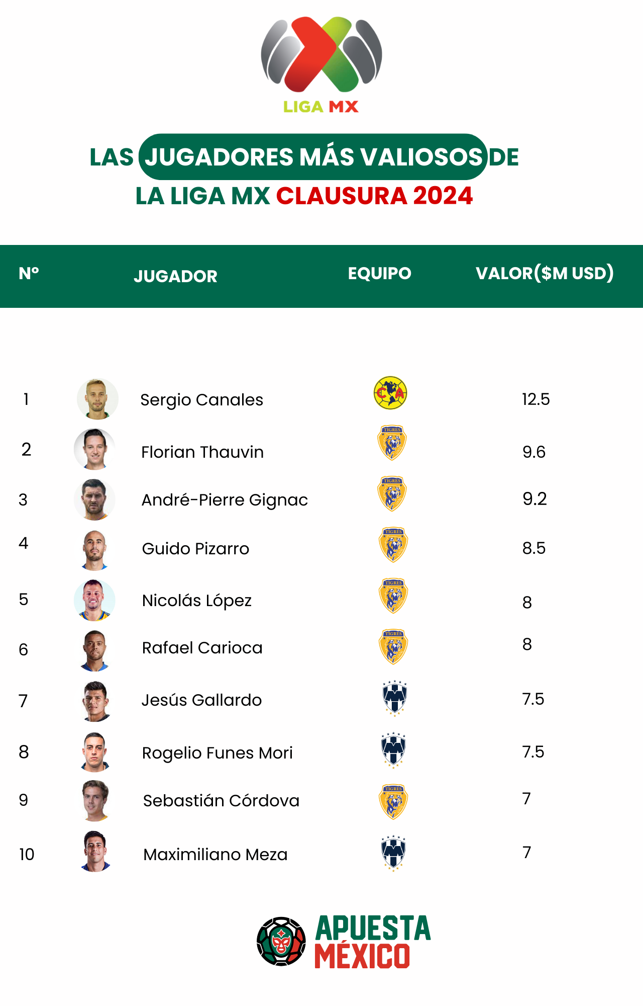 Estrellas: Sergio Canales del Club América se mantiene como el jugador más valioso de la Liga MX con un valor de $11.8 millones USD. Le siguen Florian Thauvin ($9.6 millones USD) y André-Pierre Gignac ($9.2 millones USD) de Tigres UANL