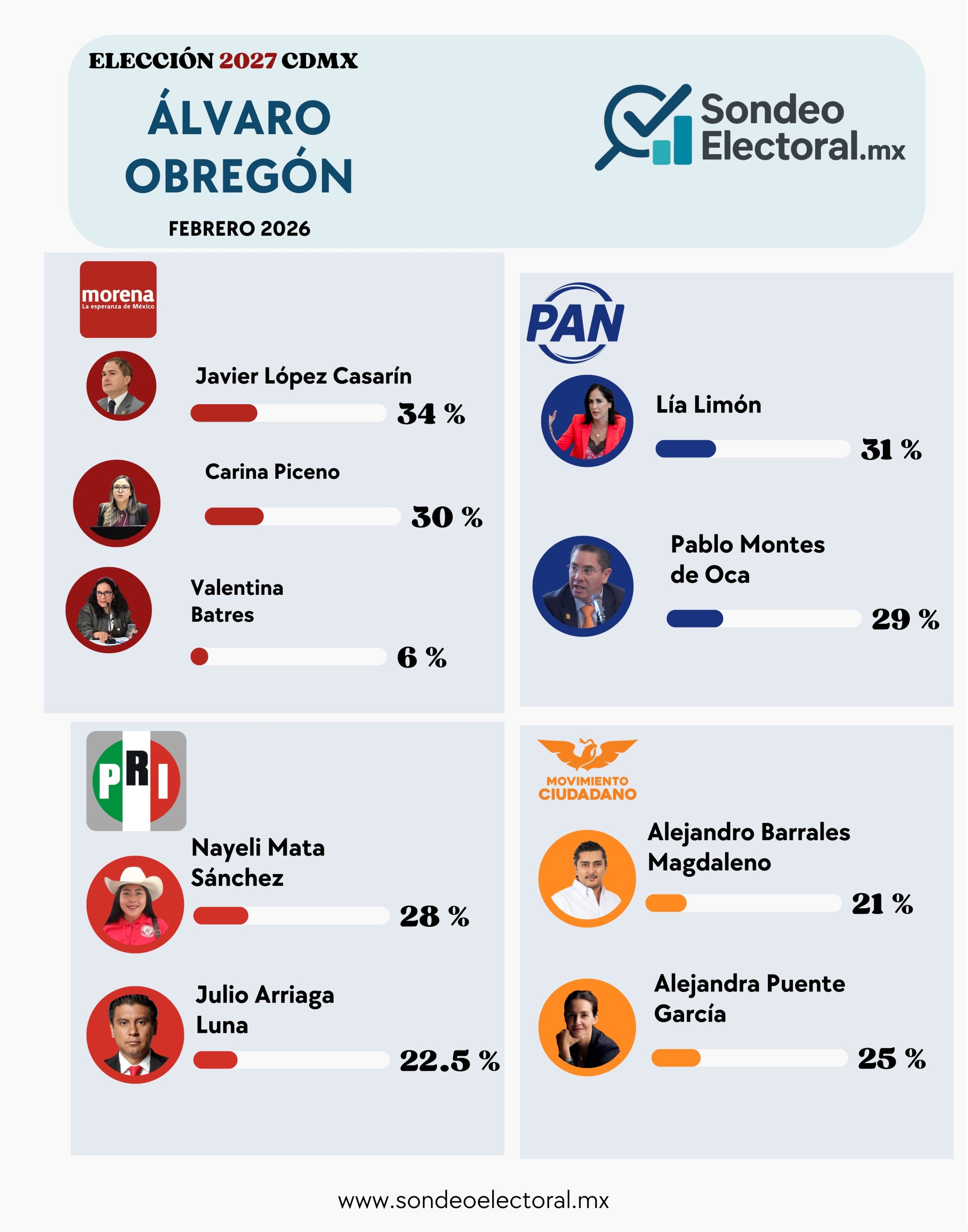 CDMX, 17 marzo 2026.- La contienda por la alcaldía de Álvaro Obregón rumbo a 2027 empieza a calentarse… y a reconfigurarse. El más golpeado en el nuevo escenario es Javier López Casarín, quien, aunque aún encabeza en Morena con 34%, muestra señales claras de desgaste y caída frente a sus competidores internos.