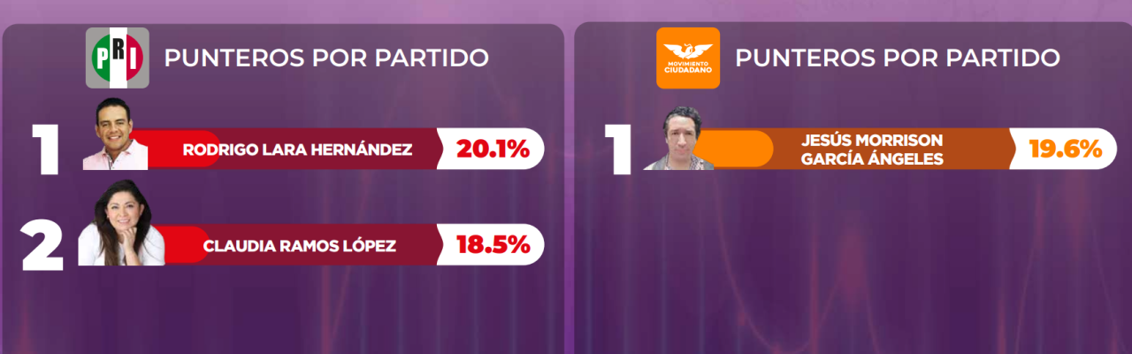 En el PRI, Rodrigo Lara Hernández (20.1%) supera a Claudia Ramos López (18.5%), pero el partido apenas registra 10.5% en preferencia general, lo que lo mantiene en un lejano tercer lugar.