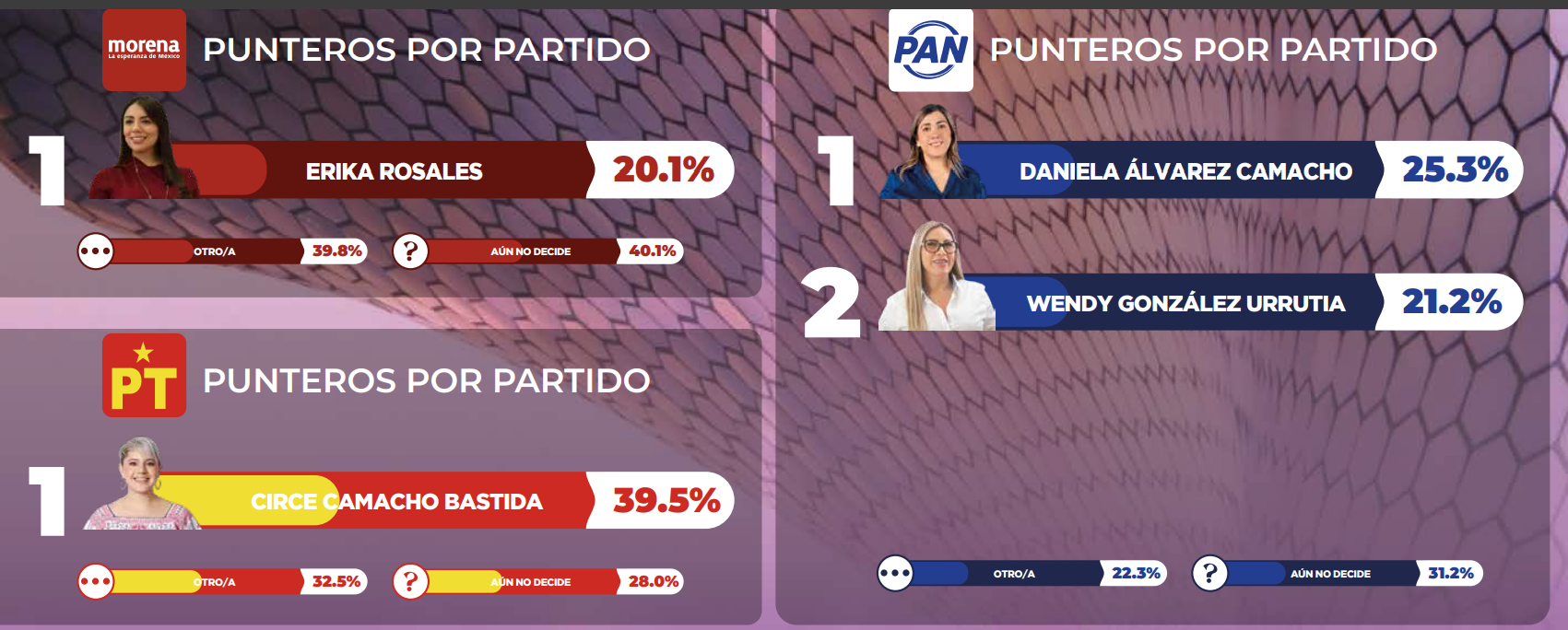 En el PAN, Daniela Álvarez Camacho encabeza con 25.3%, seguida por Wendy González Urrutia con 21.2%. No obstante, 31.2% de los simpatizantes aún no decide y 22.3% opta por otro perfil, lo que evidencia que la definición interna todavía está en construcción.