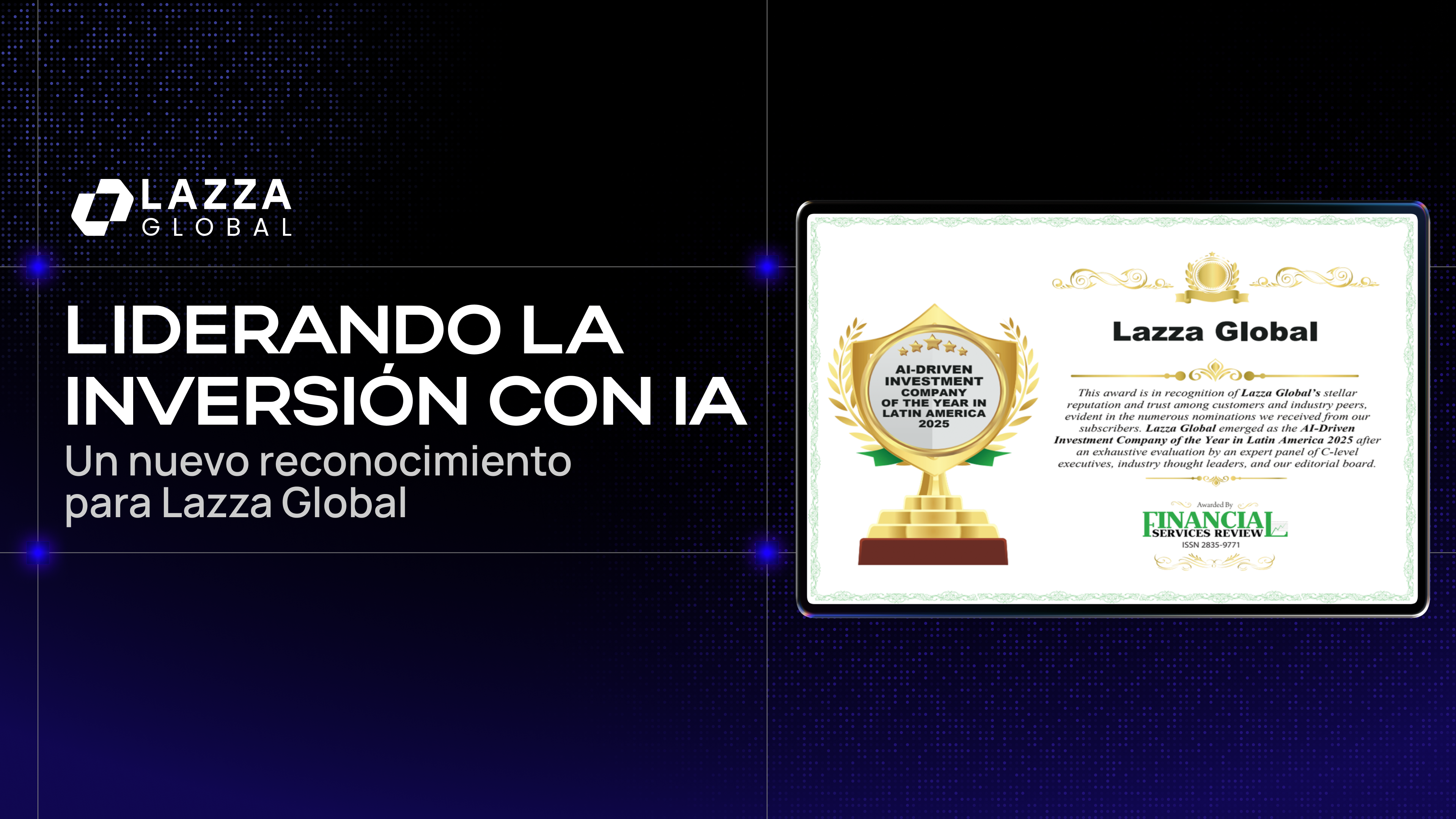 Lazza Global ha logrado lo que pocas firmas en la región pueden presumir: ser reconocida como la mejor empresa de inversión impulsada por inteligencia artificial en Latinoamérica. Este prestigioso galardón, otorgado por Financial Services Review, valida años de innovación, esfuerzo y compromiso por democratizar el acceso a los mercados financieros a través de la tecnología