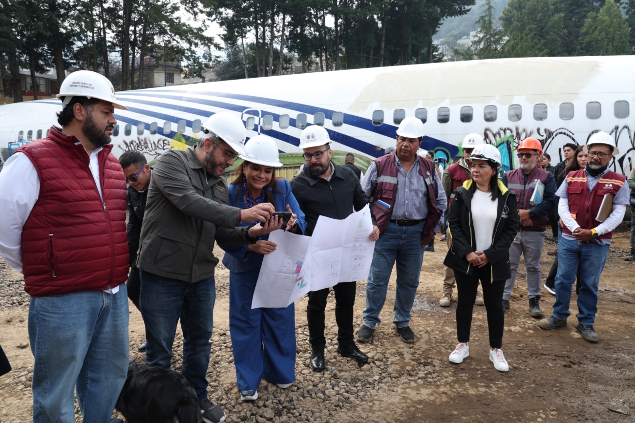 Tomemos el ejemplo más reciente: la Utopía Oyamel en Magdalena Contreras. La escena no tiene desperdicio. Clara Brugada paseando por el terreno junto al alcalde y al secretario de Obras, celebrando con aplausos y promesas lo que apenas es una estructura de columnas y trabes. Ah, pero el golpe de efecto fue la llegada triunfal de un avión reciclado, que servirá como biblioteca, aula digital y, agárrate, como resbaladilla gigante para los niños.
