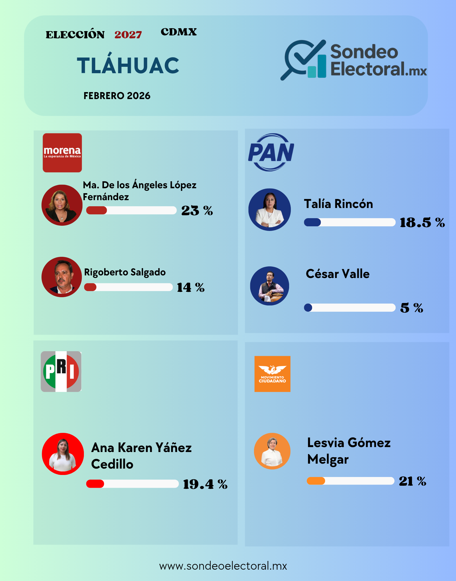 La medición de SondeoElectoral.mx de febrero 2026 muestra a Ma. de los Ángeles López Fernández con 23%, apenas sosteniéndose en primer lugar, pero muy lejos de consolidar hegemonía. Detrás, el dato más revelador: Rigoberto Salgado se desploma hasta 14%, confirmando el colapso de su grupo político al interior del partido.