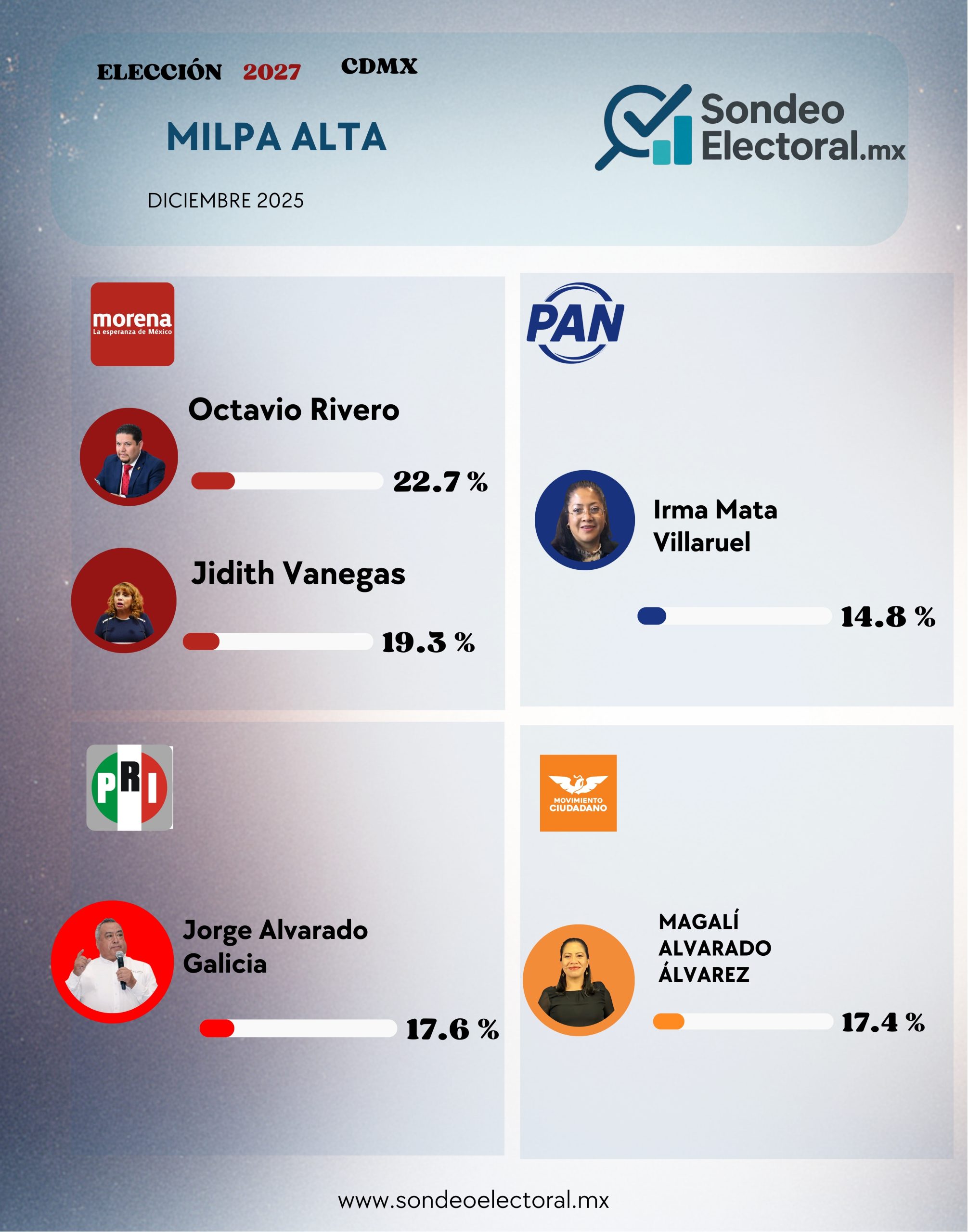 05 de febrero de 2026.- ​La caída libre de Octavio Rivero en Milpa Alta ya no es un secreto a voces, sino una realidad estadística. Según el más reciente sondeo de SondeoElectoral.mx (diciembre 2025), el actual alcalde apenas logra sostener un 22.7% de las preferencias internas en Morena. Lo que debería ser una ventaja cómoda, hoy sabe a derrota: su antecesora, Judith Vanegas, le pisa los talones con un 19.3%, evidenciando que la base morenista está fracturada y decepcionada.