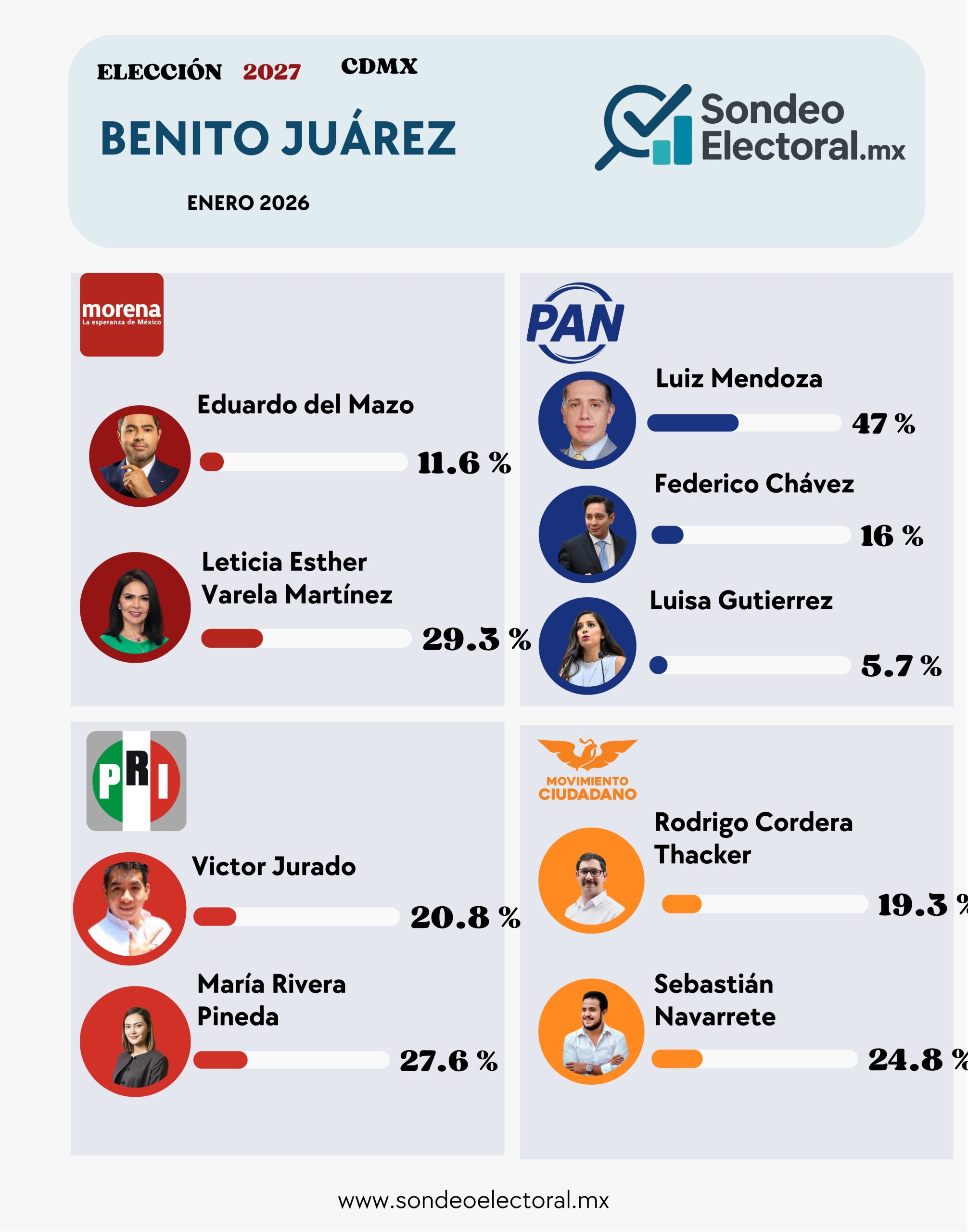 Benito Juárez ha sido históricamente bastión panista, y los números actuales sugieren que el escenario no ha cambiado de fondo. Sin embargo, la verdadera batalla comenzará cuando las candidaturas se definan oficialmente y se midan en careos directos entre partidos.Por ahora, la encuesta de enero 2026 deja algo claro: si hoy fueran las elecciones internas, el PAN tendría candidato fuerte y Morena aún estaría en proceso de consolidar su carta más competitiva.
