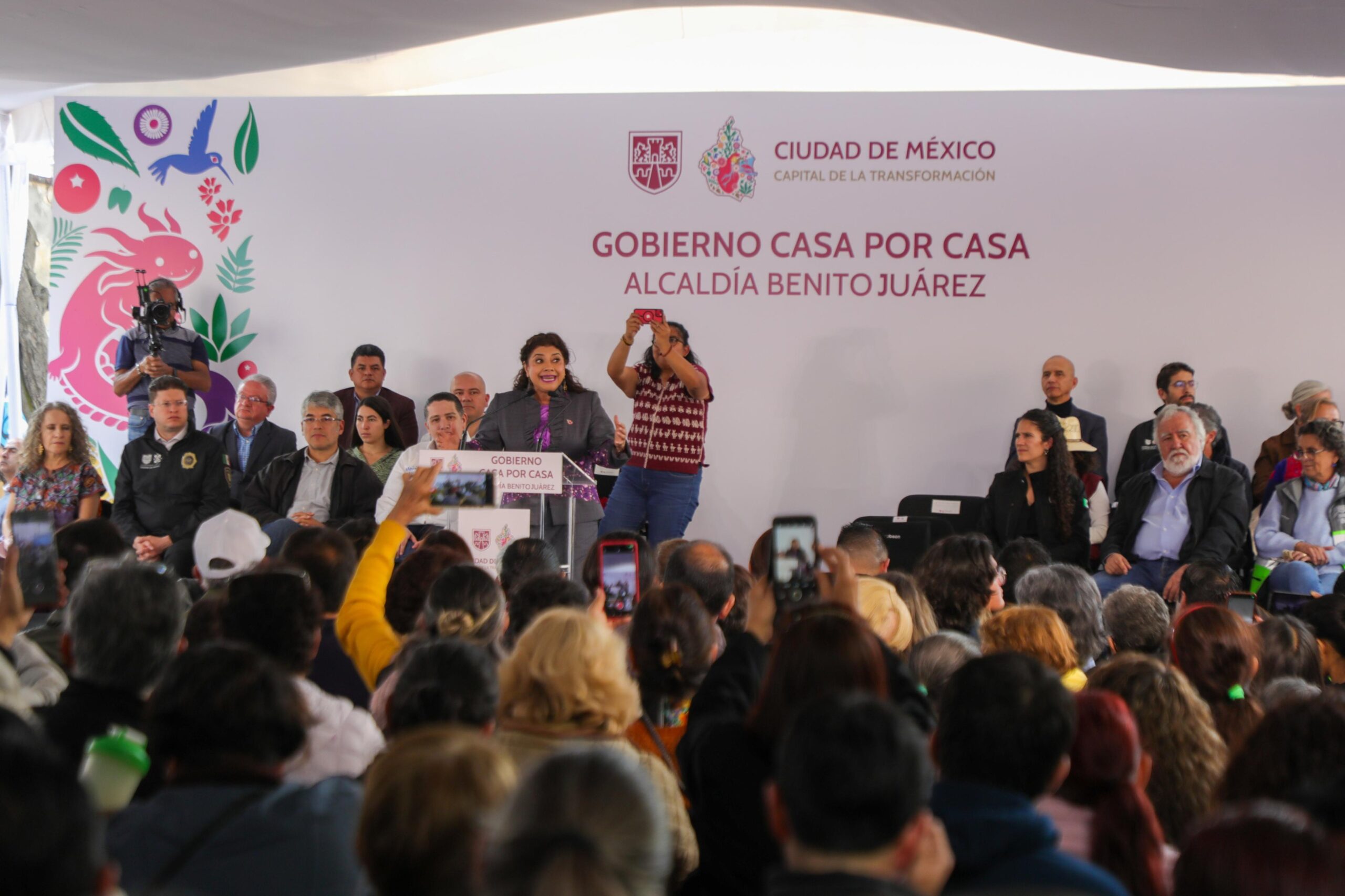 Acompañada de la mayoría de integrantes de su gabinete y en presencia del alcalde panista, Luis Mendoza, la mandataria local hizo un recuento de todos sus compromisos de campaña y recordó que una Línea de Cablebús pasará por la Benito Juárez, además de atender la demanda de seguridad en algunos puntos de la alcaldía.
